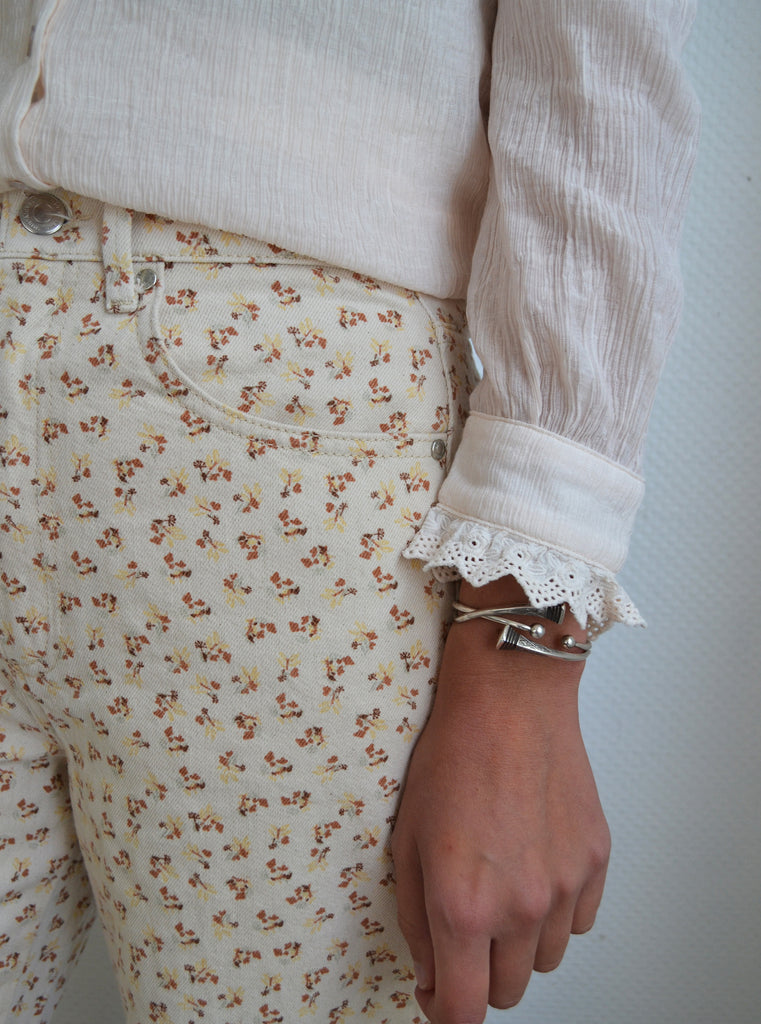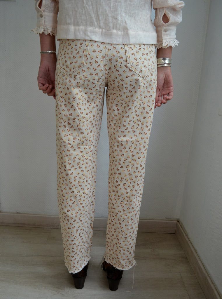 Joli pantalon en denim beige Stradivarius avec un motif fleuri effiloché sur le bas.