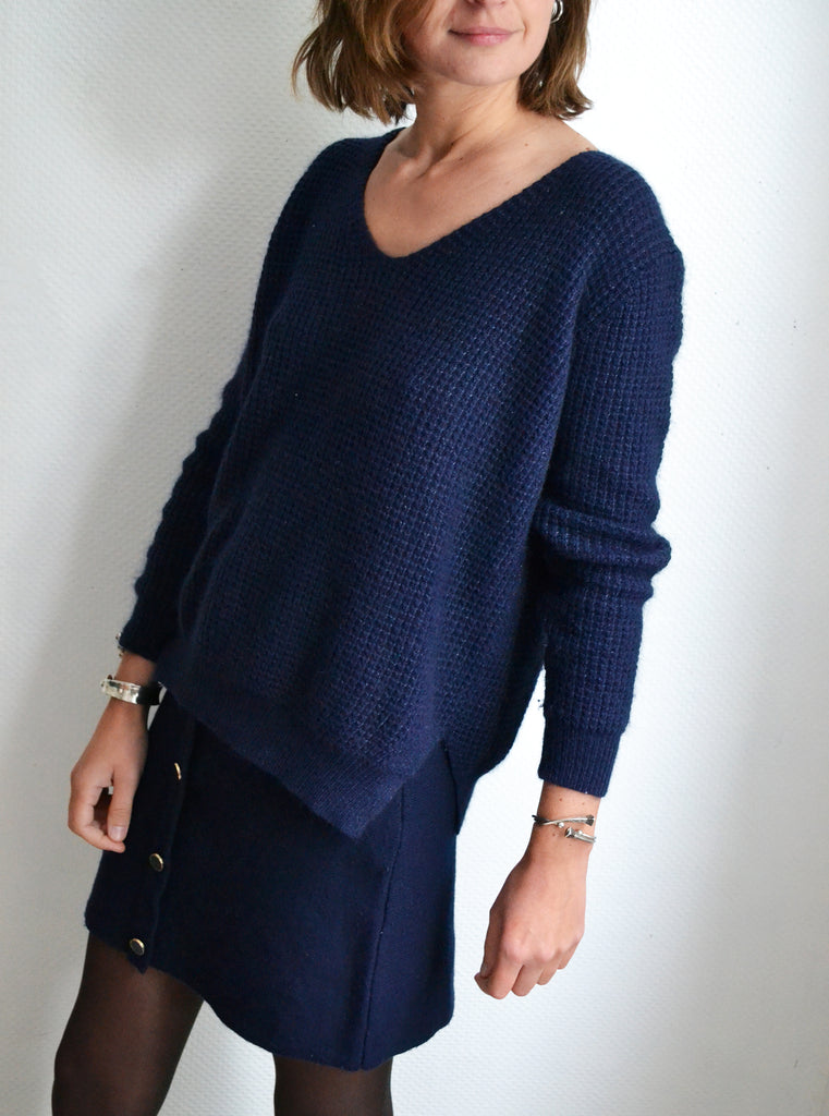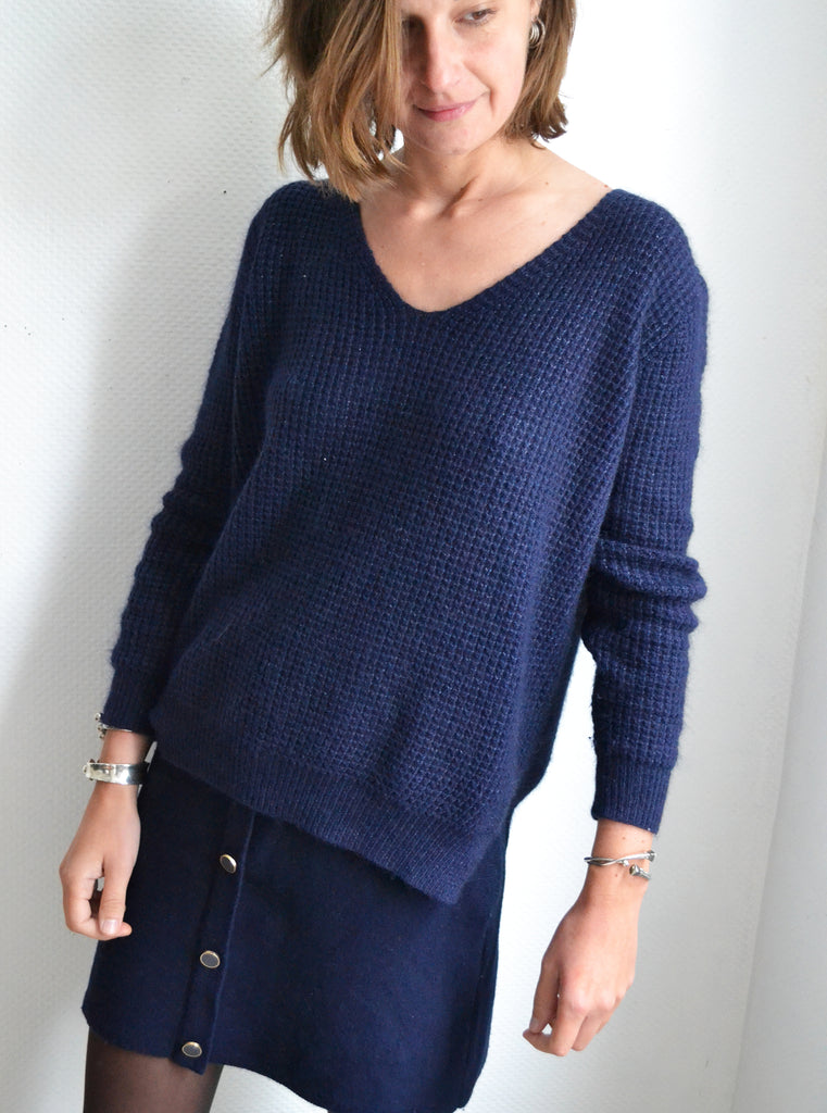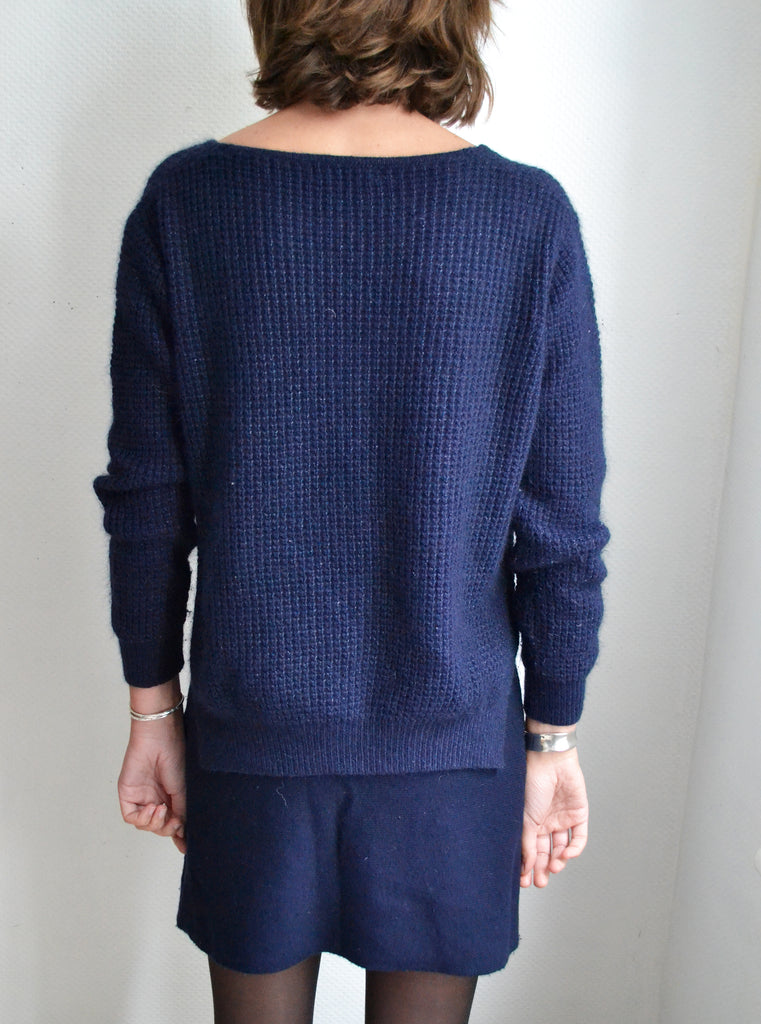 Joli pull en mailles nid d'abeille marine avec des fibres légèrement scintillants .