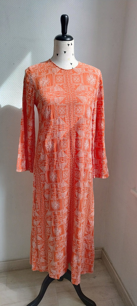 Très jolie robe longue coloris corail Zara avec des manches longue, et un joli dos nu avec des broderies style aztec contrastées.