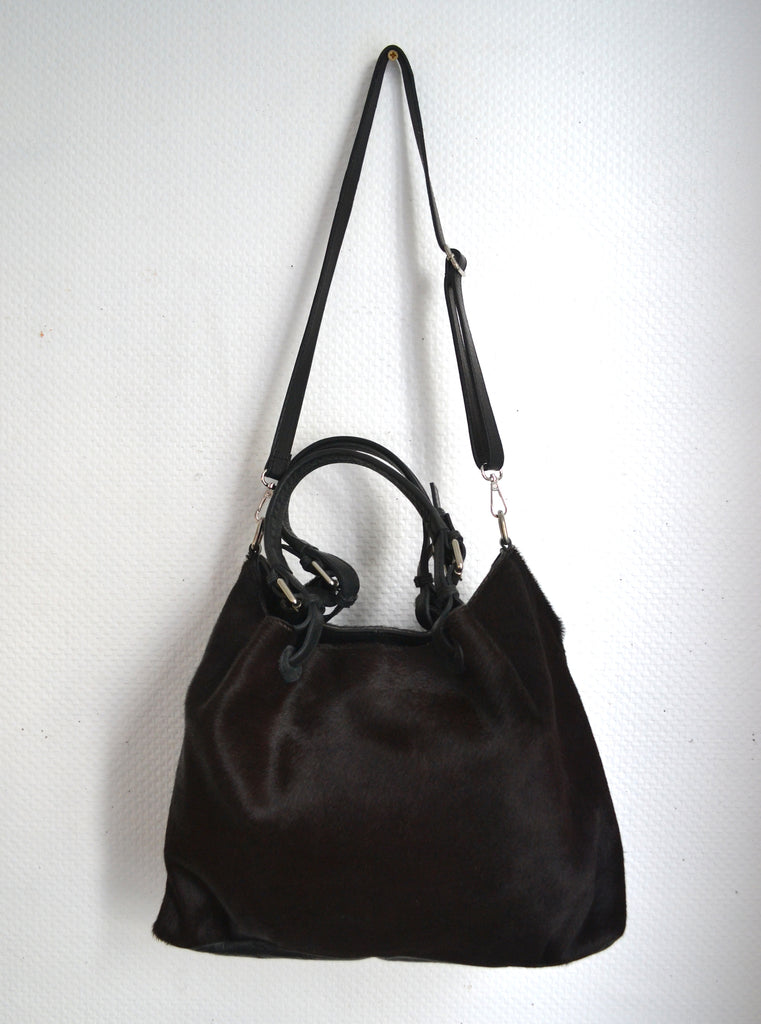 Très joli sac en cuir italien paré de poils sur la face avant et arrière.