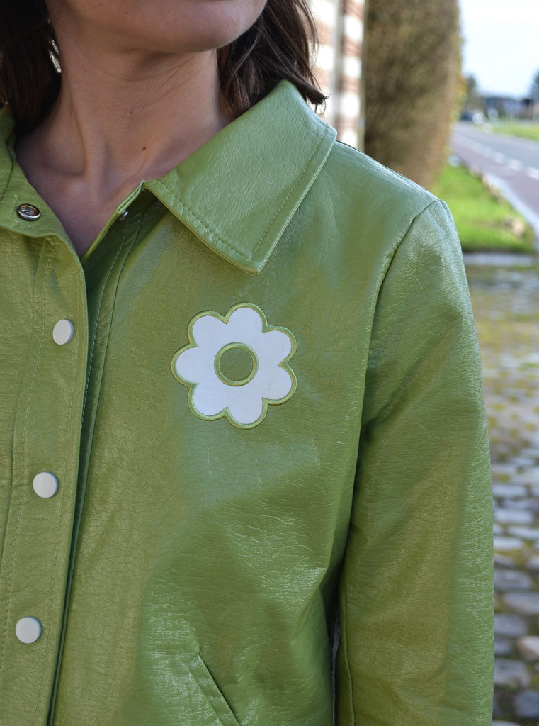 Jolie veste en vynile vert olive avec une fleur sur la poitrine,