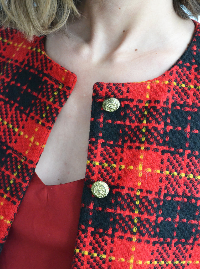Très jolie veste Tartan vintage longueur hanches avec des fausses poches sur le bas et des boutons dorés .